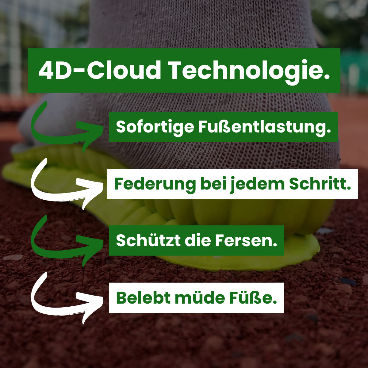 Unsere CourtComfort-Einlagen kombinieren 4D-Cloud-Technologie mit sportlicher Ergonomie. Sie dämpfen jeden Schritt, entlasten Gelenke und Muskeln und geben dir Stabilität sowie sicheren Halt. Ob im Alltag, Training oder Turnier. Entwickelt von Sportlern für Sportler, damit du schmerzfrei spielst und am nächsten Tag wieder fit bist.